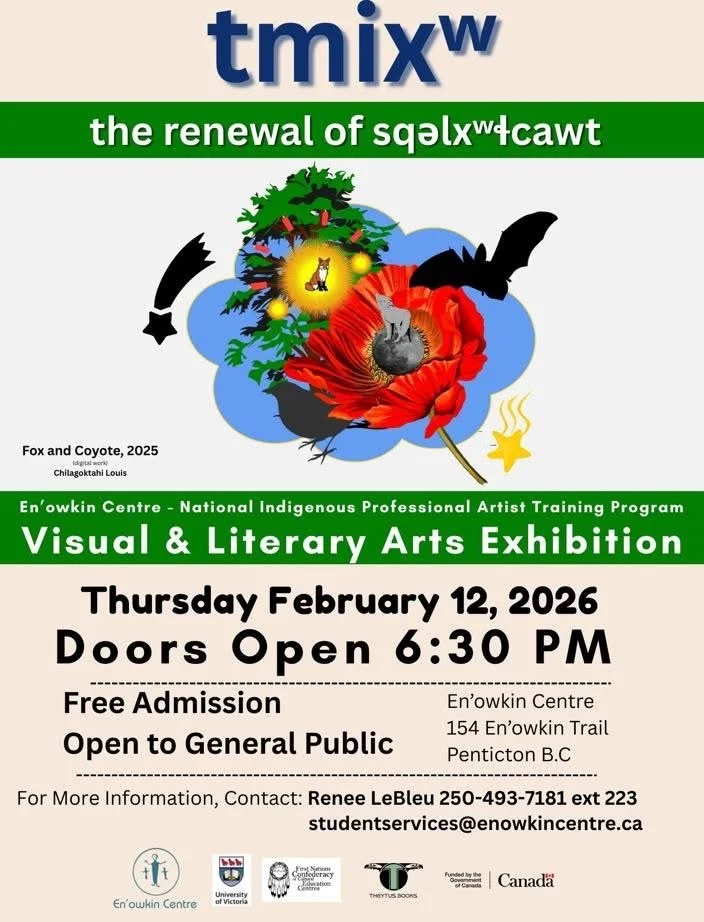 The National Indigenous Professional Artist Training Program Visual and Literary Arts Exhibition, featuring work by student artists, mentors, and invited Okanagan artists.