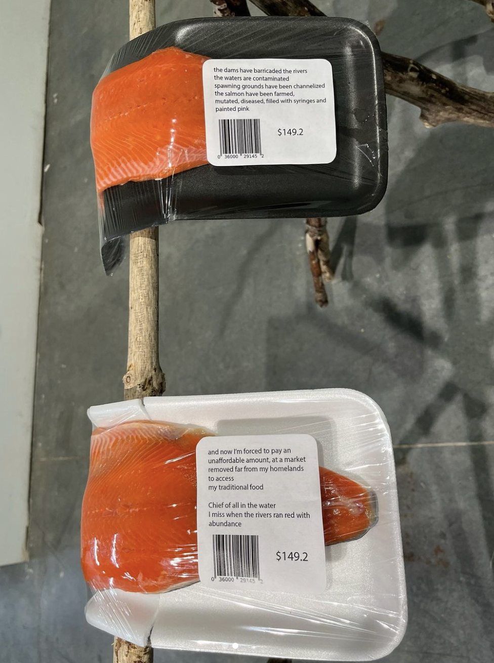 Salmon fillets, sticks, sinew, saran wrap, foam plate, printed label